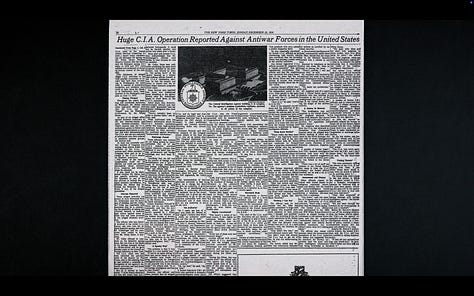 Of the many terrible truths Hersh uncovered, another which struck me was the CIA’s “Project CHAOS,” a domestic operation of the late 60s, in which our foreign intelligence service infiltrated the anti-war movement on college campuses, illegally spying on thousands of innocent American citizens in pursuit of a fictive Communist boogeyman supposedly manufacturing dissent towards America’s foreign policy in Vietnam, characterized by the wanton slaughter of civilians.