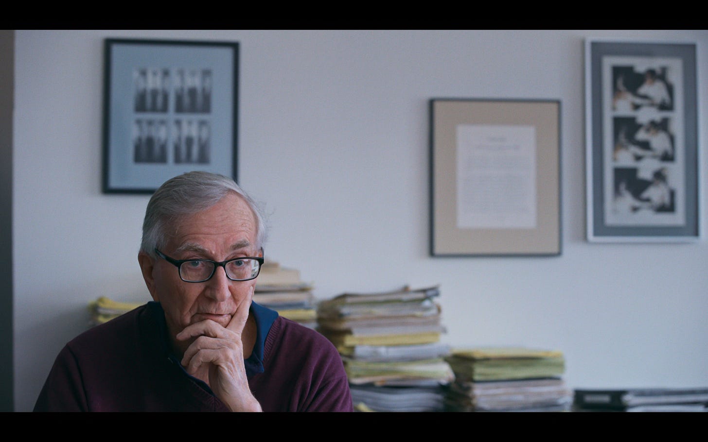 Hersh gazes off-camera, deep in thought. His Adam’s apple bobs as he swallows what might be a sob. With the slight tremor that comes with being 88 years old, he halfheartedly shrugs one shoulder and returns his gaze.